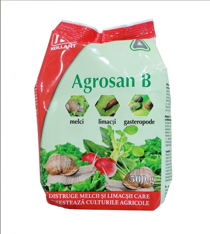 Agrosan B distruge limacsi, melci si alte gasteropode care infesteaza culturile de legume. Produsul atrage molustele cu ajutorul proteinelor continute in momeala si le distruge cu ajutorul substantei metaldehida.